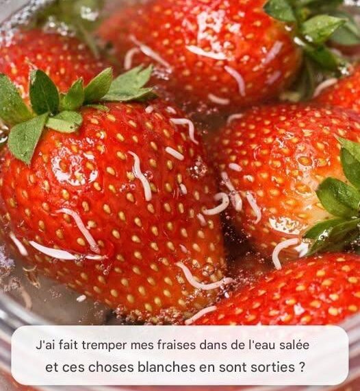 Si vous avez déjà mis des fraises dans de l’eau salée et remarqué de minuscules « vers » blancs qui en sortaient, vous n’êtes pas seul. Ces petites créatures sont généralement des larves (asticots) de certaines mouches des fruits , et non de véritables vers. Elles sont extrêmement petites — souvent de 1 à 3 millimètres de long — et, comme elles sont pâles et presque transparentes, elles peuvent être très difficiles à voir à l’intérieur de la fraise.